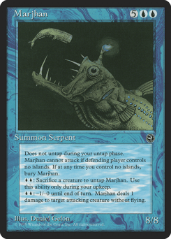 This creature doesn't untap during your untap step. {U}{U}, Sacrifice a creature: Untap this creature. Activate only during your upkeep. This creature can't attack unless defending player controls an Island. {U}{U}: This creature gets -1/-0 until end of turn and deals 1 damage to target attacking creature without flying. When you control no Islands, sacrifice this creature.