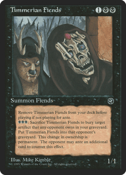 Remove this card from your deck before playing if you're not playing for ante. {B}{B}{B}, Sacrifice this creature: The owner of target artifact may ante the top card of their library. If that player doesn't, exchange ownership of that artifact and Timmerian Fiends. Put the artifact card into your graveyard and Timmerian Fiends from anywhere into that player's graveyard. This change in ownership is permanent.