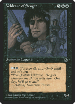 {1}{B}{B}: Veldrane gets -3/-0 and gains forestwalk until end of turn. (It can't be blocked as long as defending player controls a Forest.)