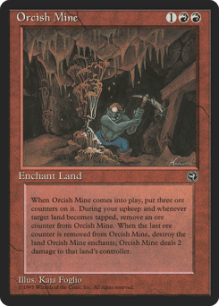 Enchant land This Aura enters with three ore counters on it. At the beginning of your upkeep and whenever enchanted land becomes tapped, remove an ore counter from this Aura. When the last ore counter is removed from this Aura, destroy enchanted land and this Aura deals 2 damage to that land's controller.