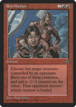 Choose two target creatures controlled by the same opponent. That player chooses and sacrifices one of those creatures. Put a -1/-1 counter on the other.