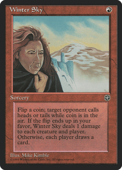 Flip a coin. If you win the flip, Winter Sky deals 1 damage to each creature and each player. If you lose the flip, each player draws a card.