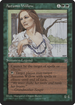 Shroud (This creature can't be the target of spells or abilities.) {G}: Until end of turn, Autumn Willow can be the target of spells and abilities controlled by target player as though it didn't have shroud.