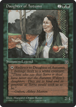 {W}: The next 1 damage that would be dealt to target white creature this turn is dealt to Daughter of Autumn instead.