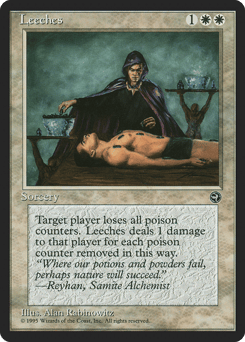 Target player loses all poison counters. Leeches deals that much damage to that player.