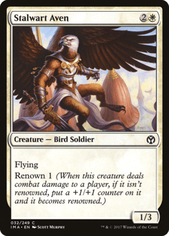 Flying (This creature can't be blocked except by creatures with flying or reach.) Renown 1 (When this creature deals combat damage to a player, if it isn't renowned, put a +1/+1 counter on it and it becomes renowned.)