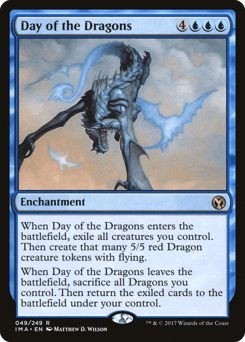 When this enchantment enters, exile all creatures you control. Then create that many 5/5 red Dragon creature tokens with flying. When this enchantment leaves the battlefield, sacrifice all Dragons you control. Then return the exiled cards to the battlefield under your control.