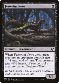 When this creature dies, target creature an opponent controls gets -1/-1 until end of turn. That creature gets -4/-4 instead if you control a creature named Bogbrew Witch.