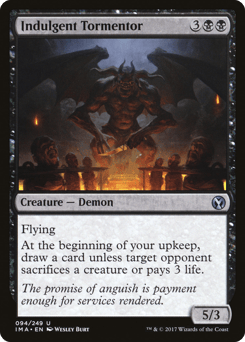 Flying At the beginning of your upkeep, draw a card unless target opponent sacrifices a creature of their choice or pays 3 life.