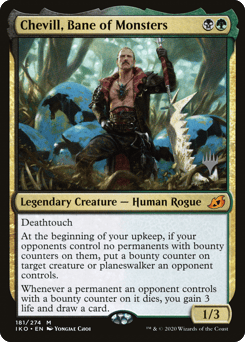 Deathtouch At the beginning of your upkeep, if your opponents control no permanents with bounty counters on them, put a bounty counter on target creature or planeswalker an opponent controls. Whenever a permanent an opponent controls with a bounty counter on it dies, you gain 3 life and draw a card.