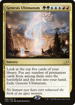 Look at the top five cards of your library. Put any number of permanent cards from among them onto the battlefield and the rest into your hand. Exile Genesis Ultimatum.