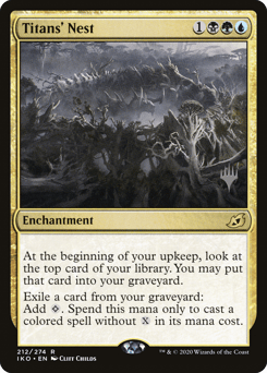 At the beginning of your upkeep, surveil 1. (Look at the top card of your library. You may put that card into your graveyard.) Exile a card from your graveyard: Add {C}. Spend this mana only to cast a spell that's one or more colors without {X} in its mana cost.