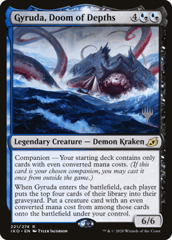Companion — Your starting deck contains only cards with even mana values. (If this card is your chosen companion, you may put it into your hand from outside the game for {3} as a sorcery.) When Gyruda enters, each player mills four cards. Put a creature card with an even mana value from among the milled cards onto the battlefield under your control.