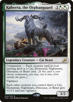 Companion — Each creature card in your starting deck is a Cat, Elemental, Nightmare, Dinosaur, or Beast card. (If this card is your chosen companion, you may put it into your hand from outside the game for {3} as a sorcery.) Vigilance Each other creature you control that's a Cat, Elemental, Nightmare, Dinosaur, or Beast gets +1/+1 and has vigilance.