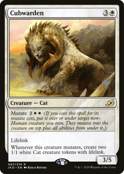 Mutate {2}{W}{W} (If you cast this spell for its mutate cost, put it over or under target non-Human creature you own. They mutate into the creature on top plus all abilities from under it.) Lifelink Whenever this creature mutates, create two 1/1 white Cat creature tokens with lifelink.