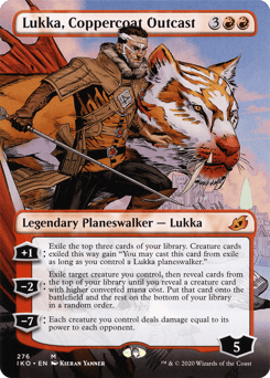 [+1]: Exile the top three cards of your library. Creature cards exiled this way gain "You may cast this card from exile as long as you control a Lukka planeswalker." [−2]: Exile target creature you control, then reveal cards from the top of your library until you reveal a creature card with greater mana value. Put that card onto the battlefield and the rest on the bottom of your library in a random order. [−7]: Each creature you control deals damage equal to its power to each opponent.