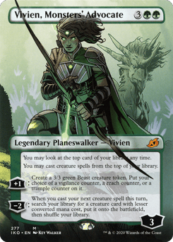 You may look at the top card of your library any time. You may cast creature spells from the top of your library. [+1]: Create a 3/3 green Beast creature token. Put your choice of a vigilance counter, a reach counter, or a trample counter on it. [−2]: When you next cast a creature spell this turn, search your library for a creature card with lesser mana value, put it onto the battlefield, then shuffle.