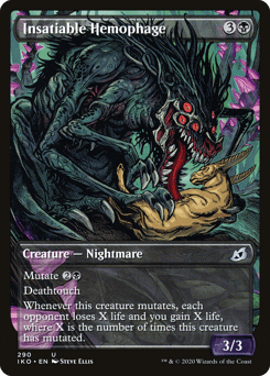 Mutate {2}{B} (If you cast this spell for its mutate cost, put it over or under target non-Human creature you own. They mutate into the creature on top plus all abilities from under it.) Deathtouch Whenever this creature mutates, each opponent loses X life and you gain X life, where X is the number of times this creature has mutated.