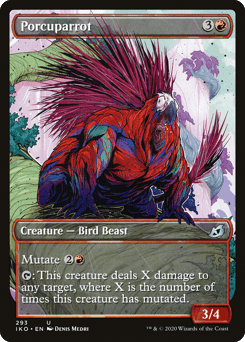 Mutate {3}{R/G}{U}{U} (If you cast this spell for its mutate cost, put it over or under target non-Human creature you own. They mutate into the creature on top plus all abilities from under it.) Flying, trample Whenever this creature mutates, exile cards from the top of your library until you exile a nonland permanent card. Put that card onto the battlefield or into your hand.