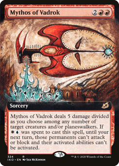 Mythos of Vadrok deals 5 damage divided as you choose among any number of target creatures and/or planeswalkers. If {W}{U} was spent to cast this spell, until your next turn, those permanents can't attack or block and their activated abilities can't be activated.