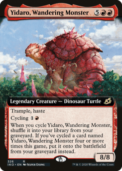 Trample, haste Cycling {1}{R} When you cycle this card, shuffle it into your library from your graveyard. If you've cycled a card named Yidaro, Wandering Monster four or more times this game, put it onto the battlefield from your graveyard instead. (Do this before you draw.)