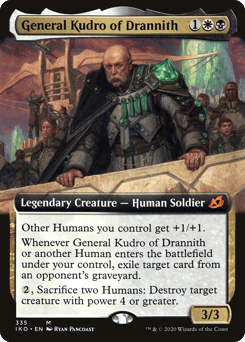 Other Humans you control get +1/+1. Whenever General Kudro or another Human you control enters, exile target card from an opponent's graveyard. {2}, Sacrifice two Humans: Destroy target creature with power 4 or greater.