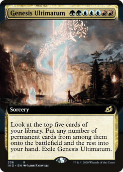 Look at the top five cards of your library. Put any number of permanent cards from among them onto the battlefield and the rest into your hand. Exile Genesis Ultimatum.