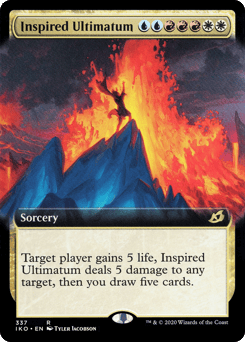 Target player gains 5 life, Inspired Ultimatum deals 5 damage to any target, then you draw five cards.
