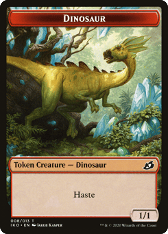 Trample Whenever one or more creatures you control with trample deal combat damage to a player, create an X/X green Dinosaur Beast creature token with trample, where X is the amount of damage those creatures dealt to that player.