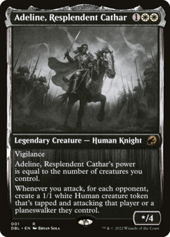 Vigilance Adeline's power is equal to the number of creatures you control. Whenever you attack, for each opponent, create a 1/1 white Human creature token that's tapped and attacking that player or a planeswalker they control.
