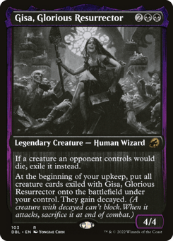 If a creature an opponent controls would die, exile it instead. At the beginning of your upkeep, put all creature cards exiled with Gisa onto the battlefield under your control. They gain decayed. (A creature with decayed can't block. When it attacks, sacrifice it at end of combat.)