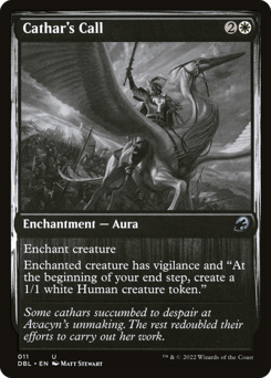 Enchant creature Enchanted creature has vigilance and "At the beginning of your end step, create a 1/1 white Human creature token."