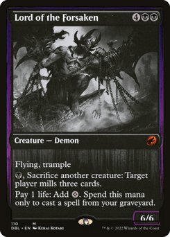 Flying, trample {B}, Sacrifice another creature: Target player mills three cards. Pay 1 life: Add {C}. Spend this mana only to cast a spell from your graveyard.