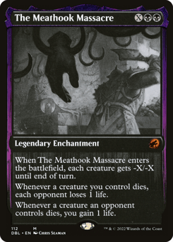 When The Meathook Massacre enters, each creature gets -X/-X until end of turn. Whenever a creature you control dies, each opponent loses 1 life. Whenever a creature an opponent controls dies, you gain 1 life.