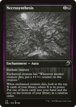 Enchant creature Enchanted creature has "Whenever another creature dies, put a +1/+1 counter on this creature." When enchanted creature dies, look at the top X cards of your library, where X is its power. Put one of those cards into your hand and the rest on the bottom of your library in a random order.