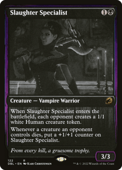 When this creature enters, each opponent creates a 1/1 white Human creature token. Whenever a creature an opponent controls dies, put a +1/+1 counter on this creature.