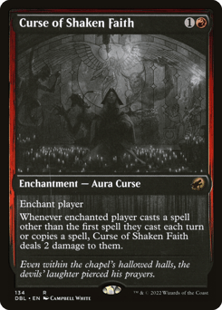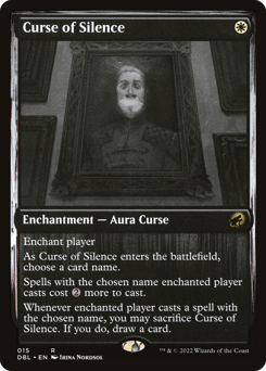 Enchant player As this Aura enters, choose a card name. Spells with the chosen name enchanted player casts cost {2} more to cast. Whenever enchanted player casts a spell with the chosen name, you may sacrifice this Aura. If you do, draw a card.