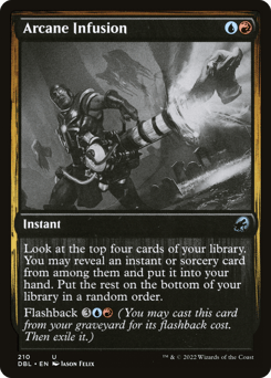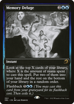 Look at the top X cards of your library, where X is the amount of mana spent to cast this spell. Put two of them into your hand and the rest on the bottom of your library in a random order. Flashback {5}{U}{U} (You may cast this card from your graveyard for its flashback cost. Then exile it.)