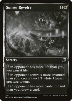 If an opponent has more life than you, you gain 4 life. If an opponent controls more creatures than you, create two 1/1 white Human creature tokens. If an opponent has more cards in hand than you, draw a card.