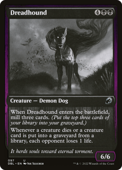 When this creature enters, mill three cards. (Put the top three cards of your library into your graveyard.) Whenever a creature dies or a creature card is put into a graveyard from a library, each opponent loses 1 life.