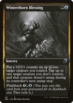 Put a +1/+1 counter on up to one target creature you control. Tap up to one target creature you don't control, and that creature doesn't untap during its controller's next untap step. Flashback {1}{G}{U} (You may cast this card from your graveyard for its flashback cost. Then exile it.)