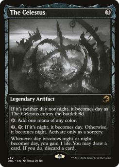 If it's neither day nor night, it becomes day as The Celestus enters. {T}: Add one mana of any color. {3}, {T}: If it's night, it becomes day. Otherwise, it becomes night. Activate only as a sorcery. Whenever day becomes night or night becomes day, you gain 1 life. You may draw a card. If you do, discard a card.