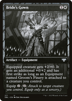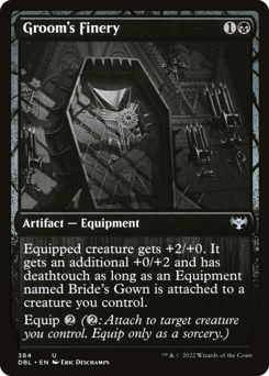Equipped creature gets +2/+0. It gets an additional +0/+2 and has first strike as long as an Equipment named Groom's Finery is attached to a creature you control. Equip {2} ({2}: Attach to target creature you control. Equip only as a sorcery.)