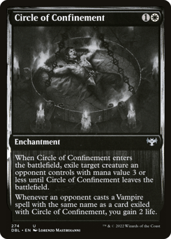 When this enchantment enters, exile target creature an opponent controls with mana value 3 or less until this enchantment leaves the battlefield. Whenever an opponent casts a Vampire spell with the same name as a card exiled with this enchantment, you gain 2 life.