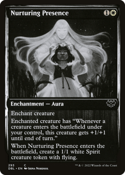 Enchant creature Enchanted creature has "Whenever a creature you control enters, this creature gets +1/+1 until end of turn." When this Aura enters, create a 1/1 white Spirit creature token with flying.