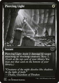 Piercing Light deals 2 damage to target attacking or blocking creature. Scry 1. (Look at the top card of your library. You may put that card on the bottom.)