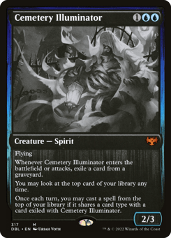 Flying Whenever this creature enters or attacks, exile a card from a graveyard. You may look at the top card of your library any time. Once each turn, you may cast a spell from the top of your library if it shares a card type with a card exiled with this creature.