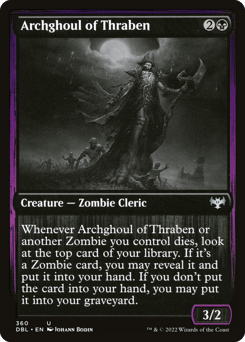 Whenever this creature or another Zombie you control dies, look at the top card of your library. If it's a Zombie card, you may reveal it and put it into your hand. If you don't put the card into your hand, you may put it into your graveyard.