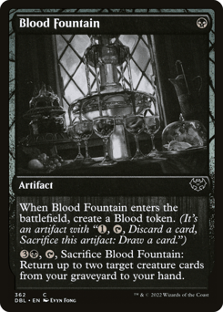 When this artifact enters, create a Blood token. (It's an artifact with "{1}, {T}, Discard a card, Sacrifice this token: Draw a card.") {3}{B}, {T}, Sacrifice this artifact: Return up to two target creature cards from your graveyard to your hand.