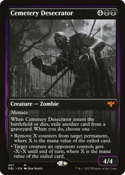 Menace When this creature enters or dies, exile another card from a graveyard. When you do, choose one — • Remove X counters from target permanent, where X is the mana value of the exiled card. • Target creature an opponent controls gets -X/-X until end of turn, where X is the mana value of the exiled card.